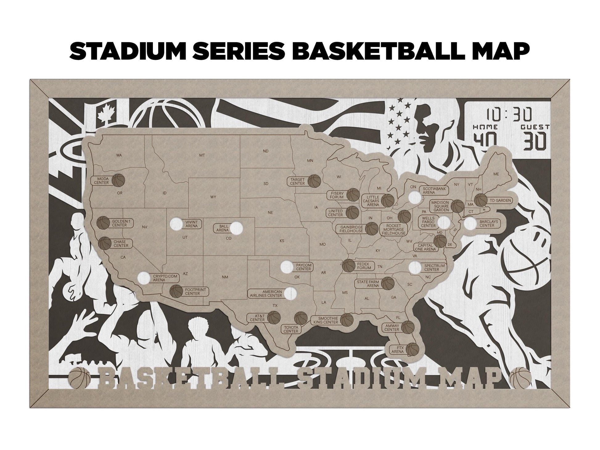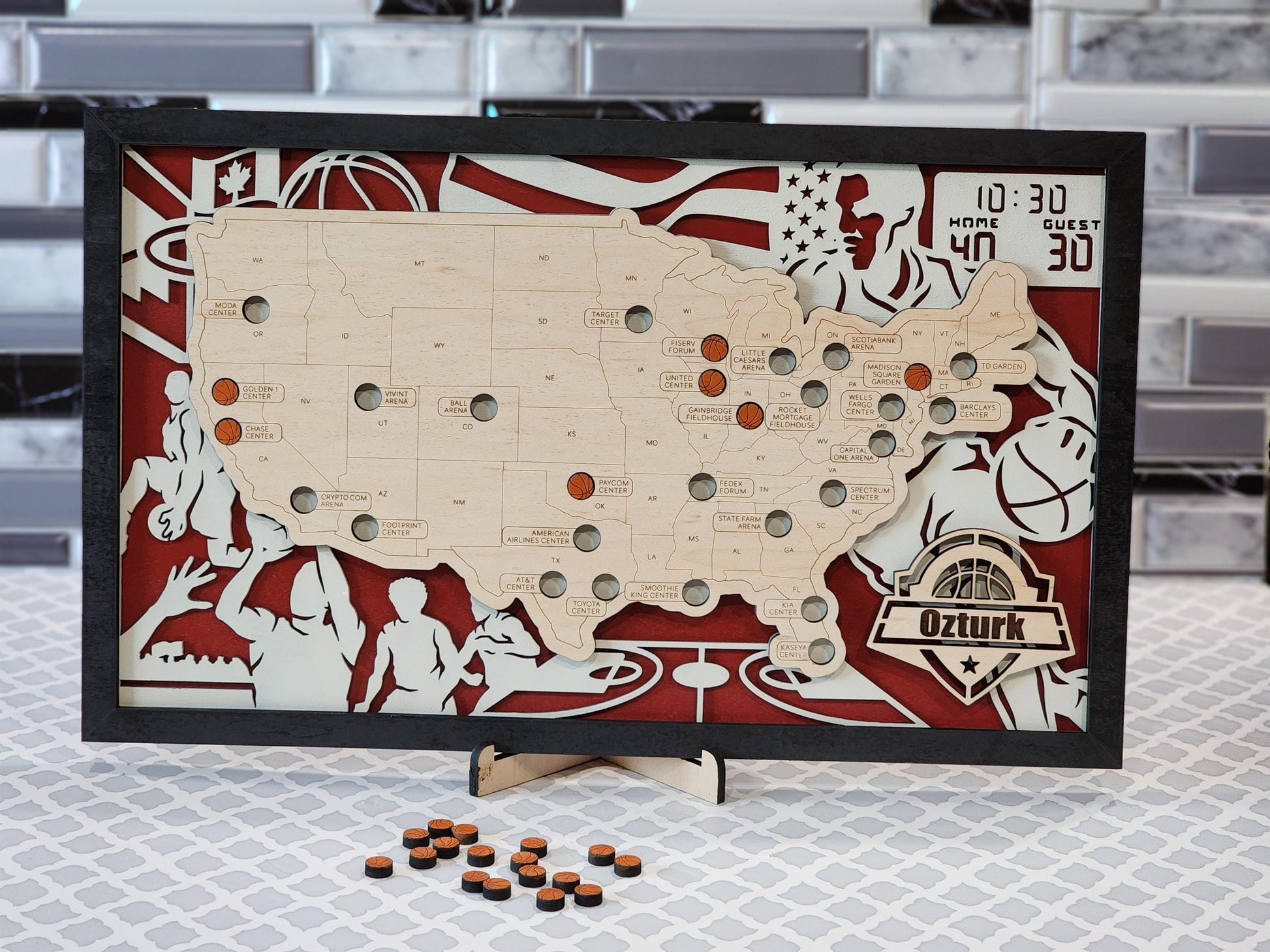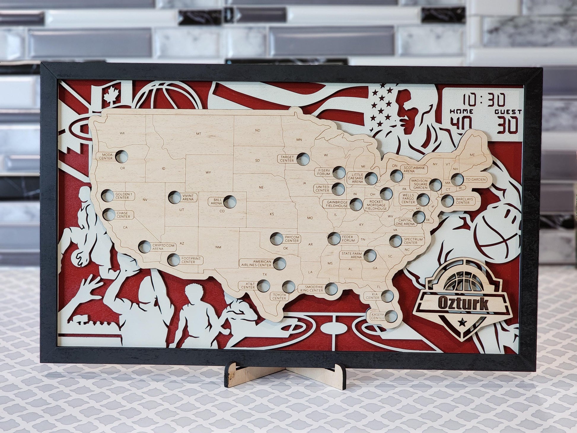This basketball/NBA stadium park map can be used to record the parks you have visited - each park has cutout basketballs that you can proudly place on the map once you've visited each park. What a great way to celebrate the amazing memories you've made! Your map will come with a small stand to set it upright on a shelf, a sawtooth hanger hole in the back to hang, as well as a little bag of basketball cutouts until the time comes to place them on the map.