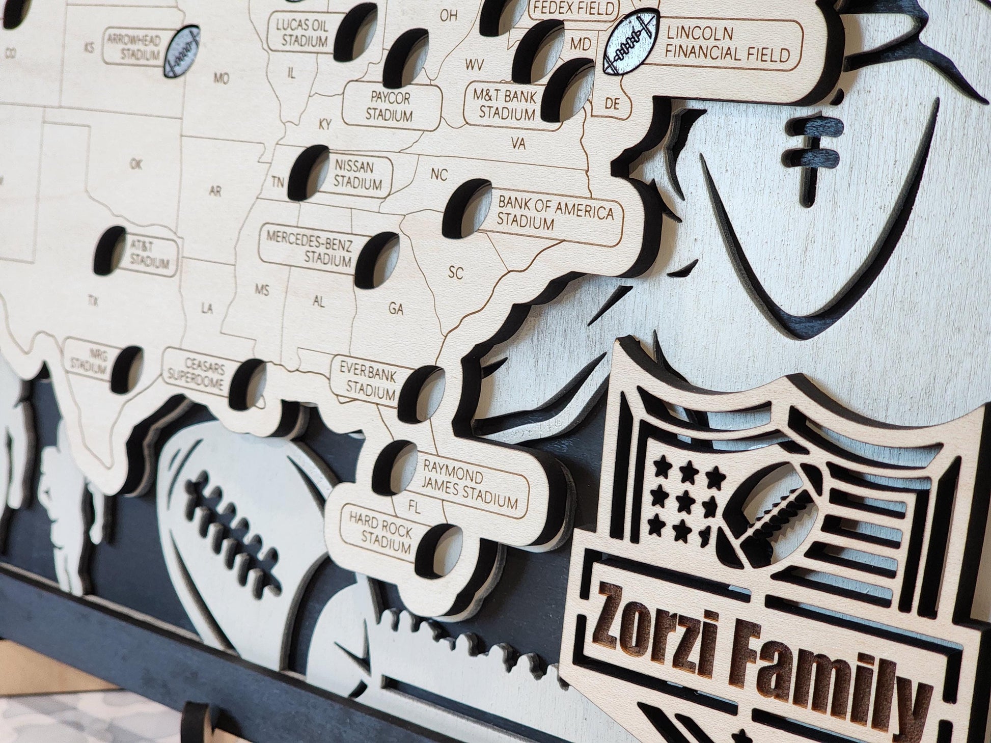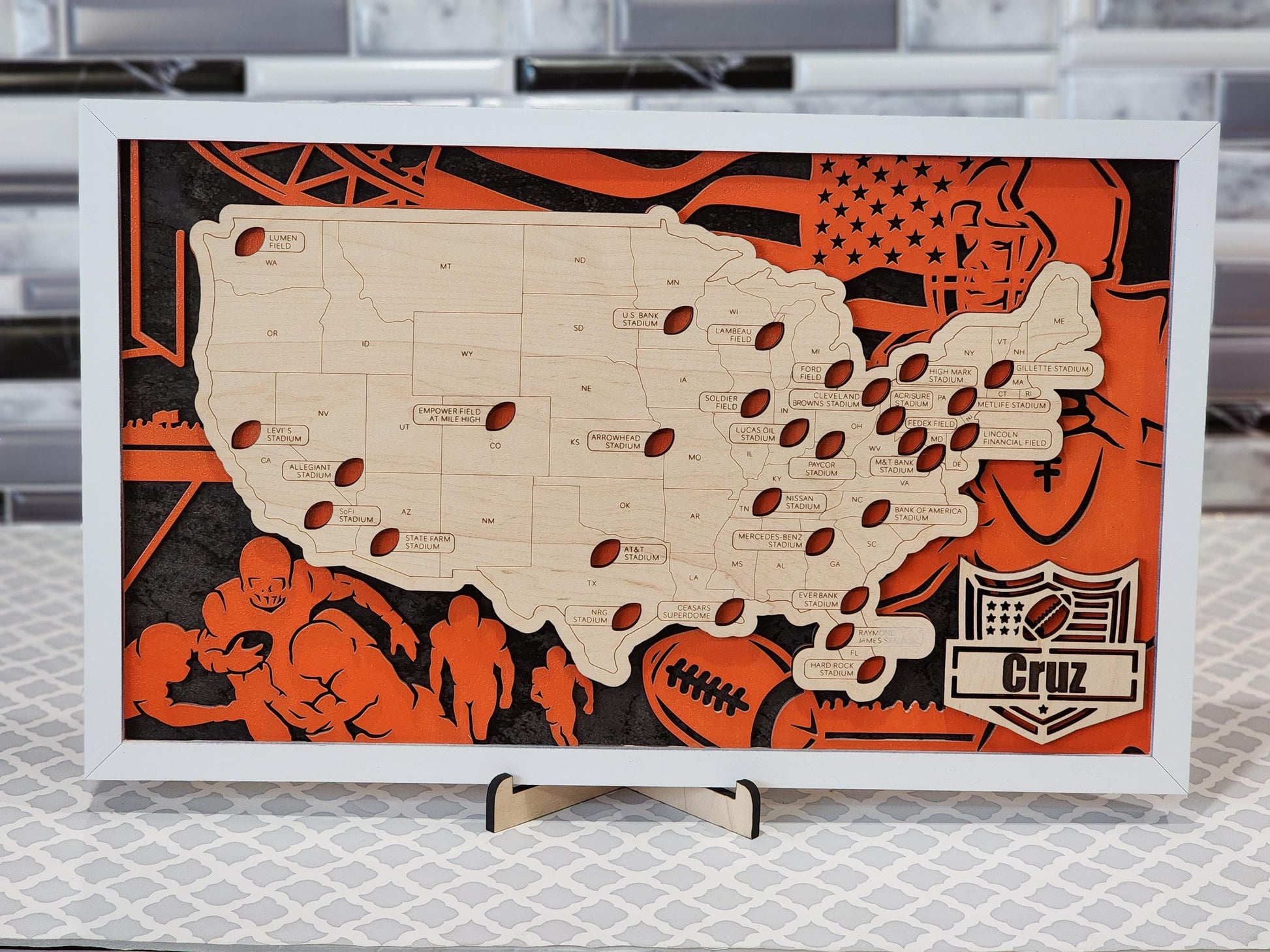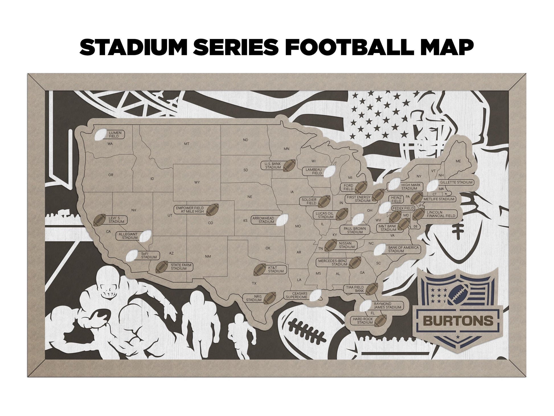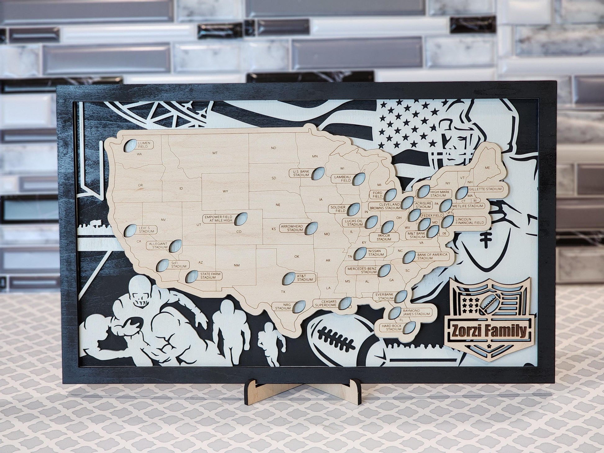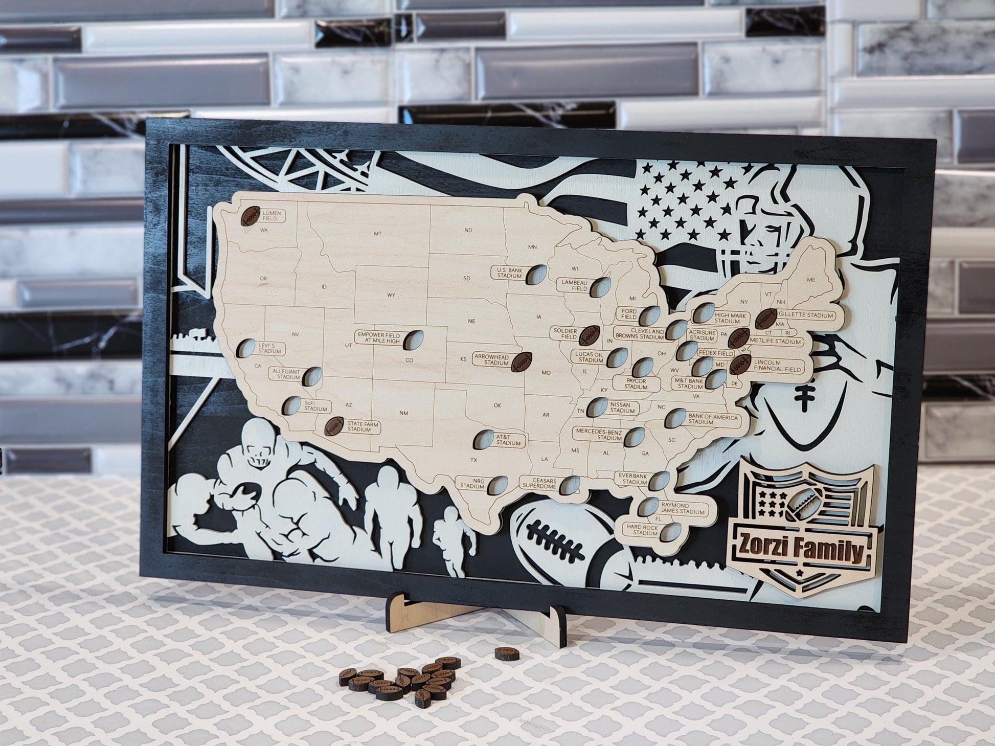 This football/NFL stadium park map can be used to record the parks you have visited - each park has cutout footballs that you can proudly place on the map once you've visited each park. What a great way to celebrate the amazing memories you've made! Your map will come with a small stand to set it upright on a shelf, a sawtooth hanger hole in the back to hang, as well as a little bag of football cutouts until the time comes to place them on the map.