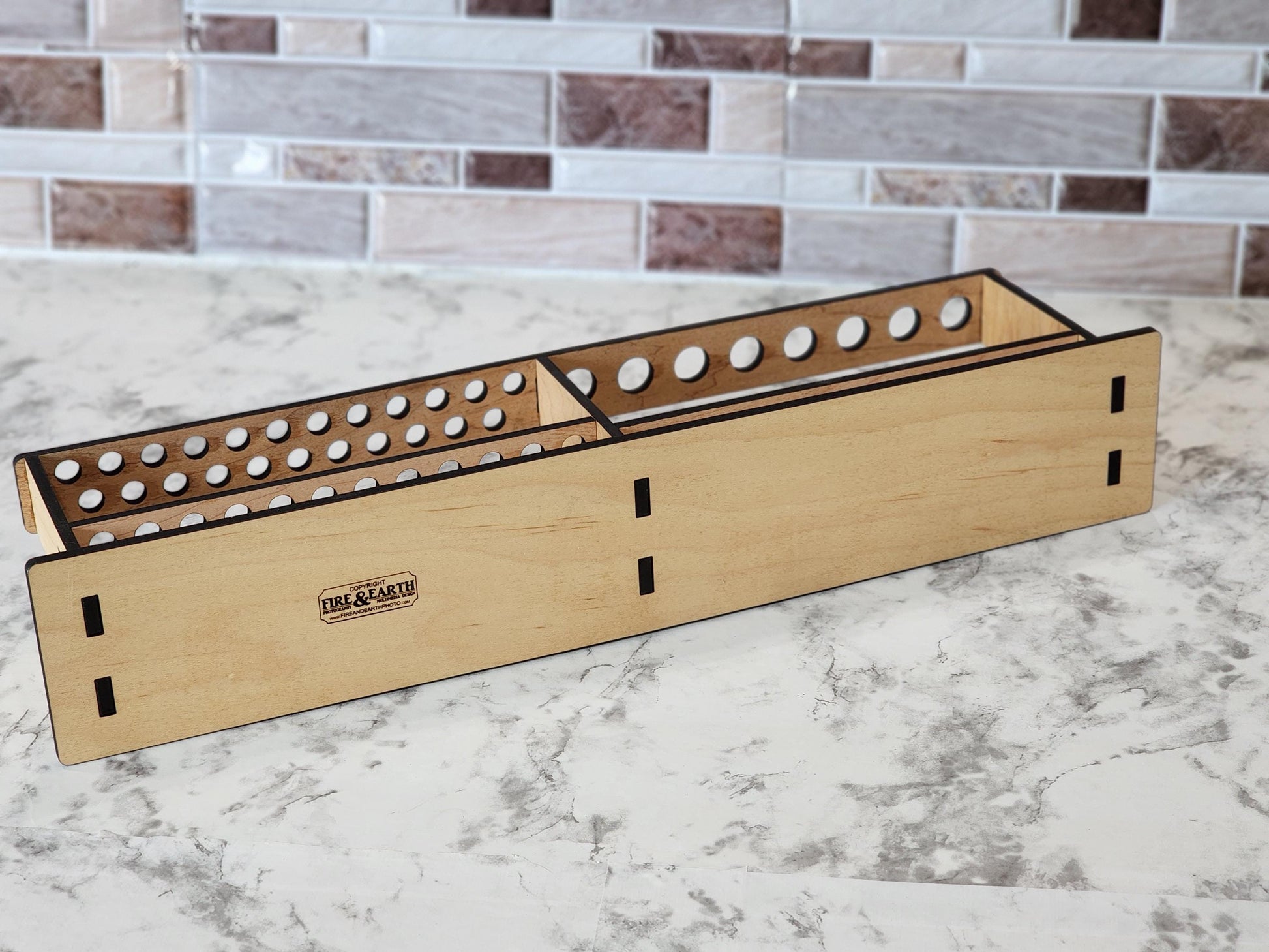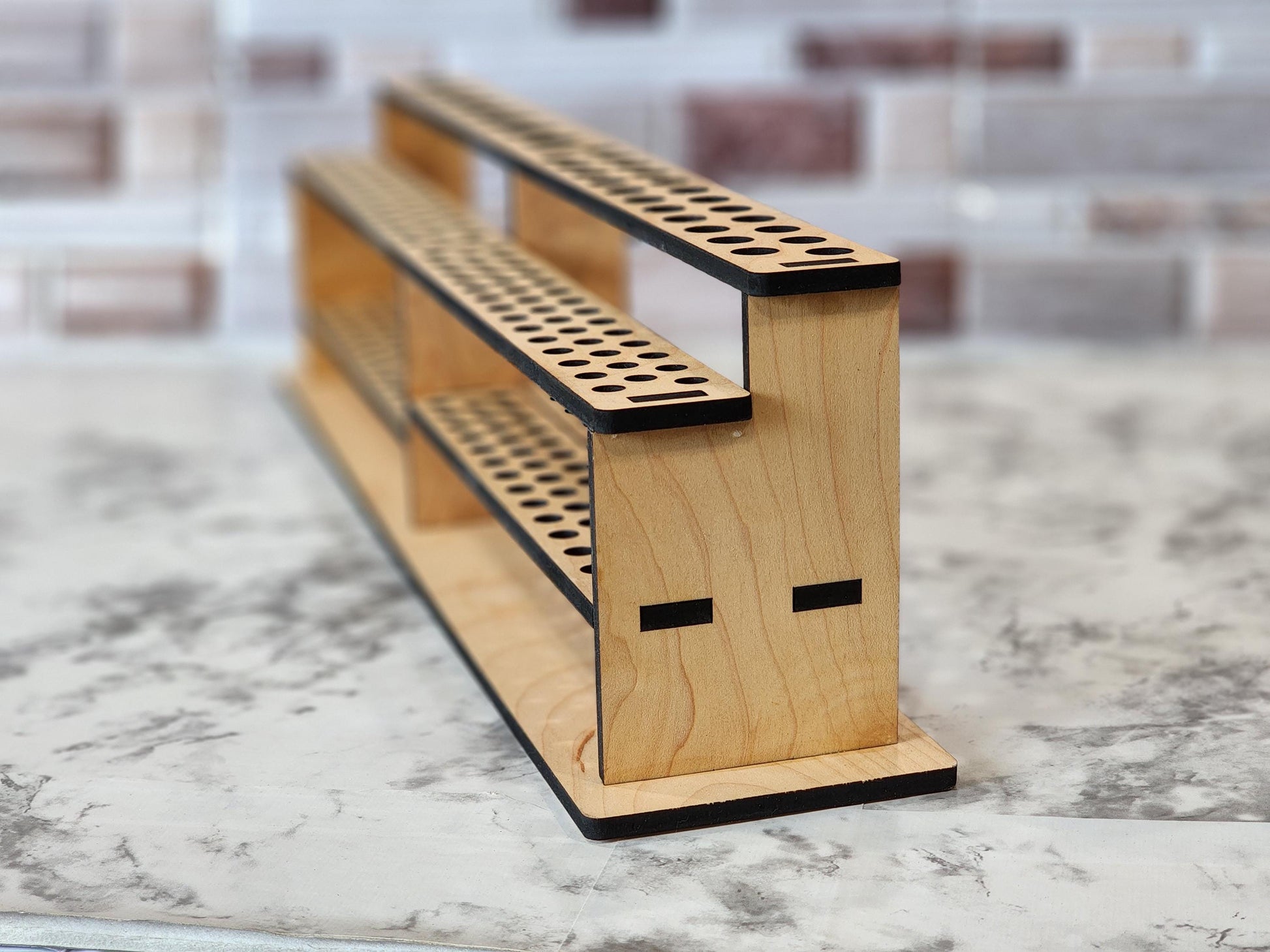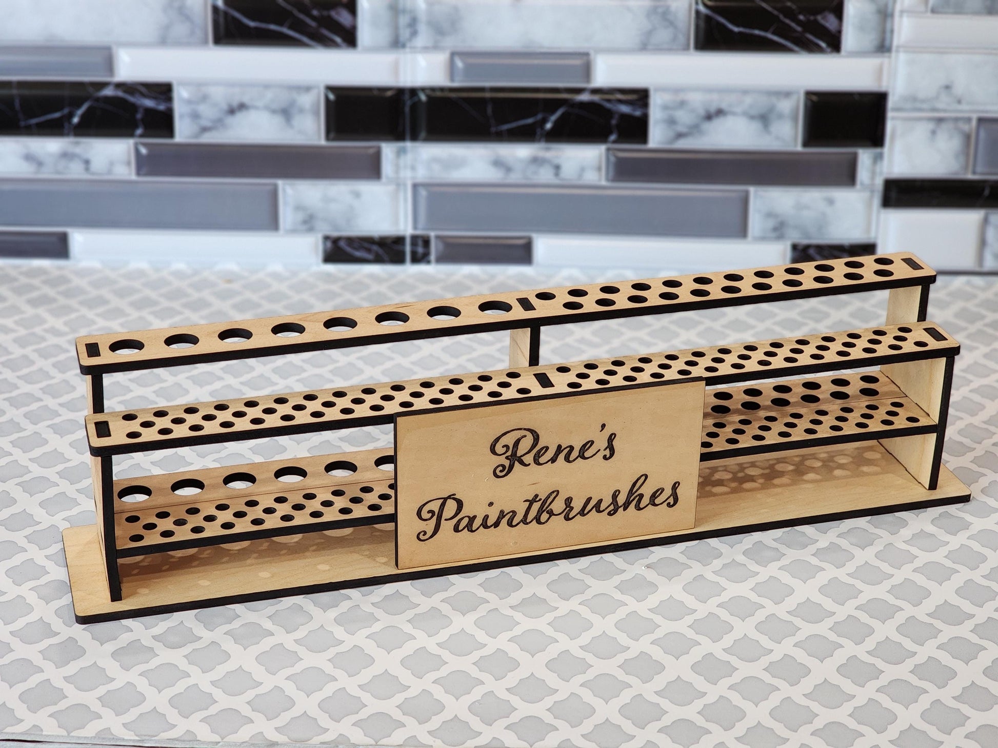 The stand's two-tier design maximizes space, allowing you to store an extensive collection of brushes, and the flat base ensures stability on any surface. 6 different hole layouts are available as well as personalization, with the option to add a custom name, business, or studio title etched into the wood, along with additional text such as your art form or personal mantra.