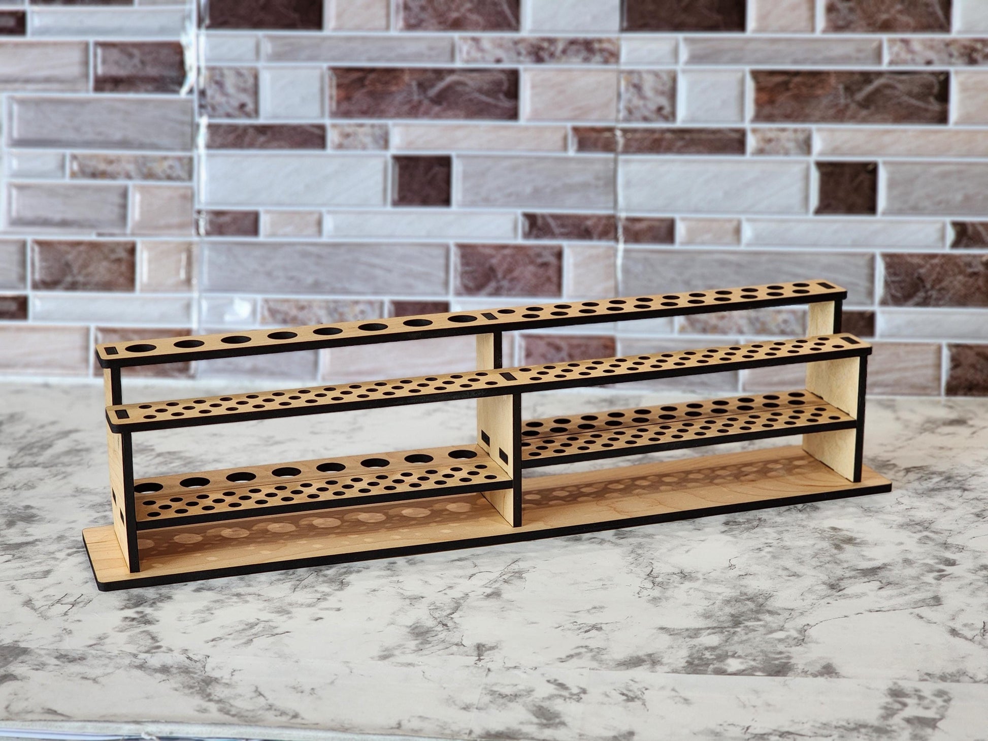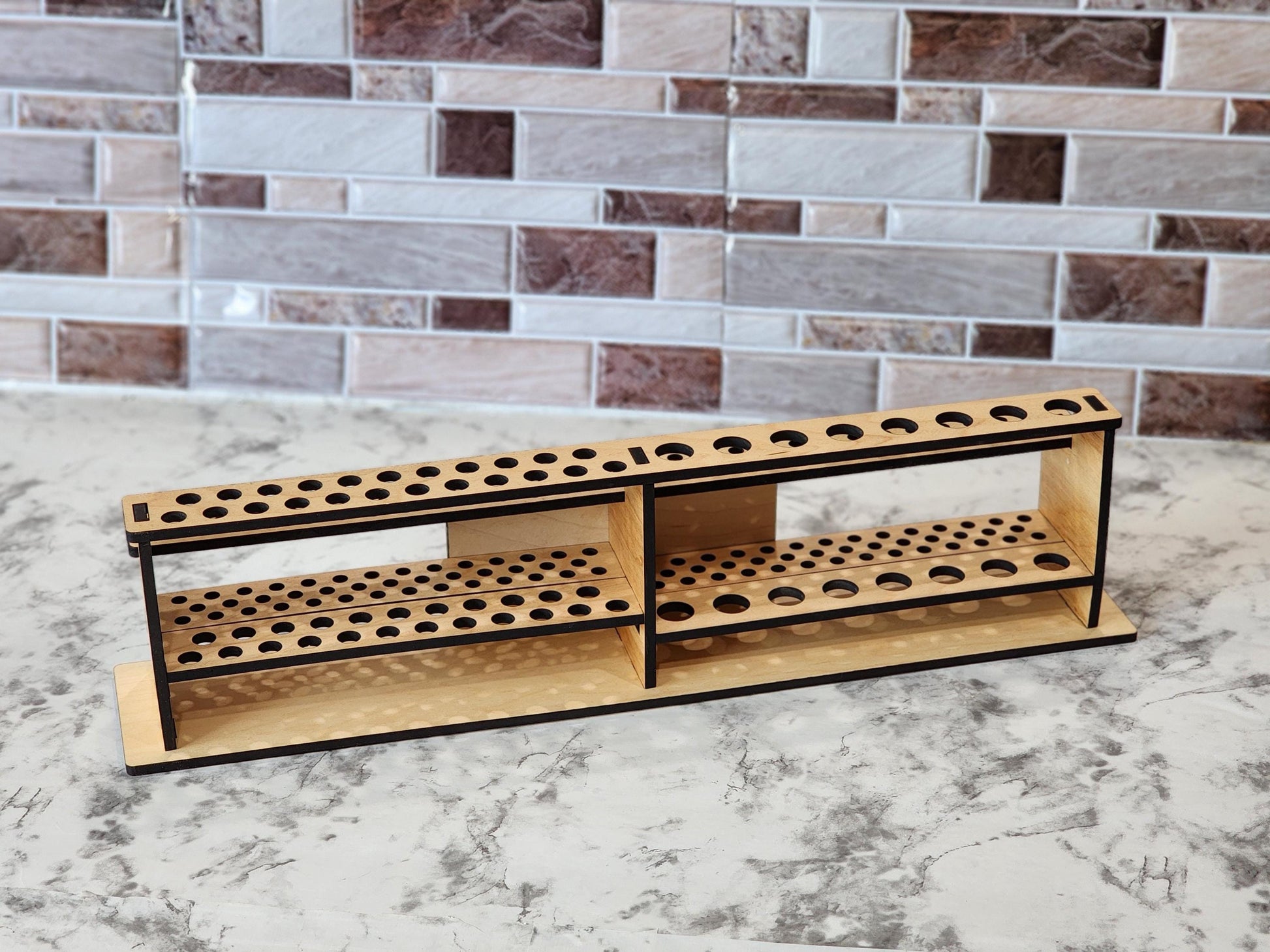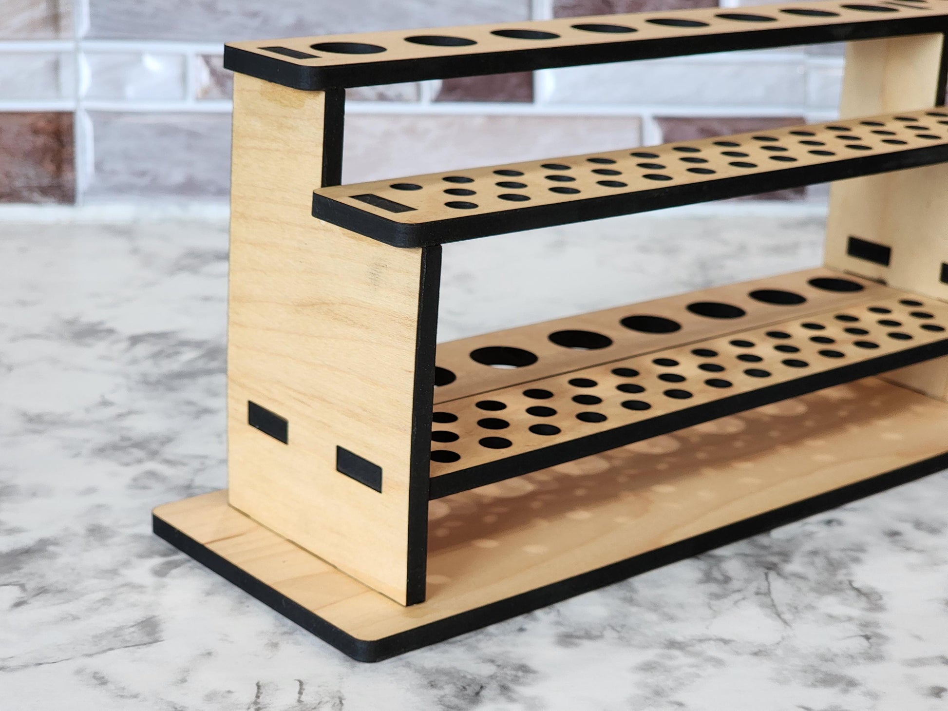 The stand's two-tier design maximizes space, allowing you to store an extensive collection of brushes, and the flat base ensures stability on any surface. 6 different hole layouts are available as well as personalization, with the option to add a custom name, business, or studio title etched into the wood, along with additional text such as your art form or personal mantra.