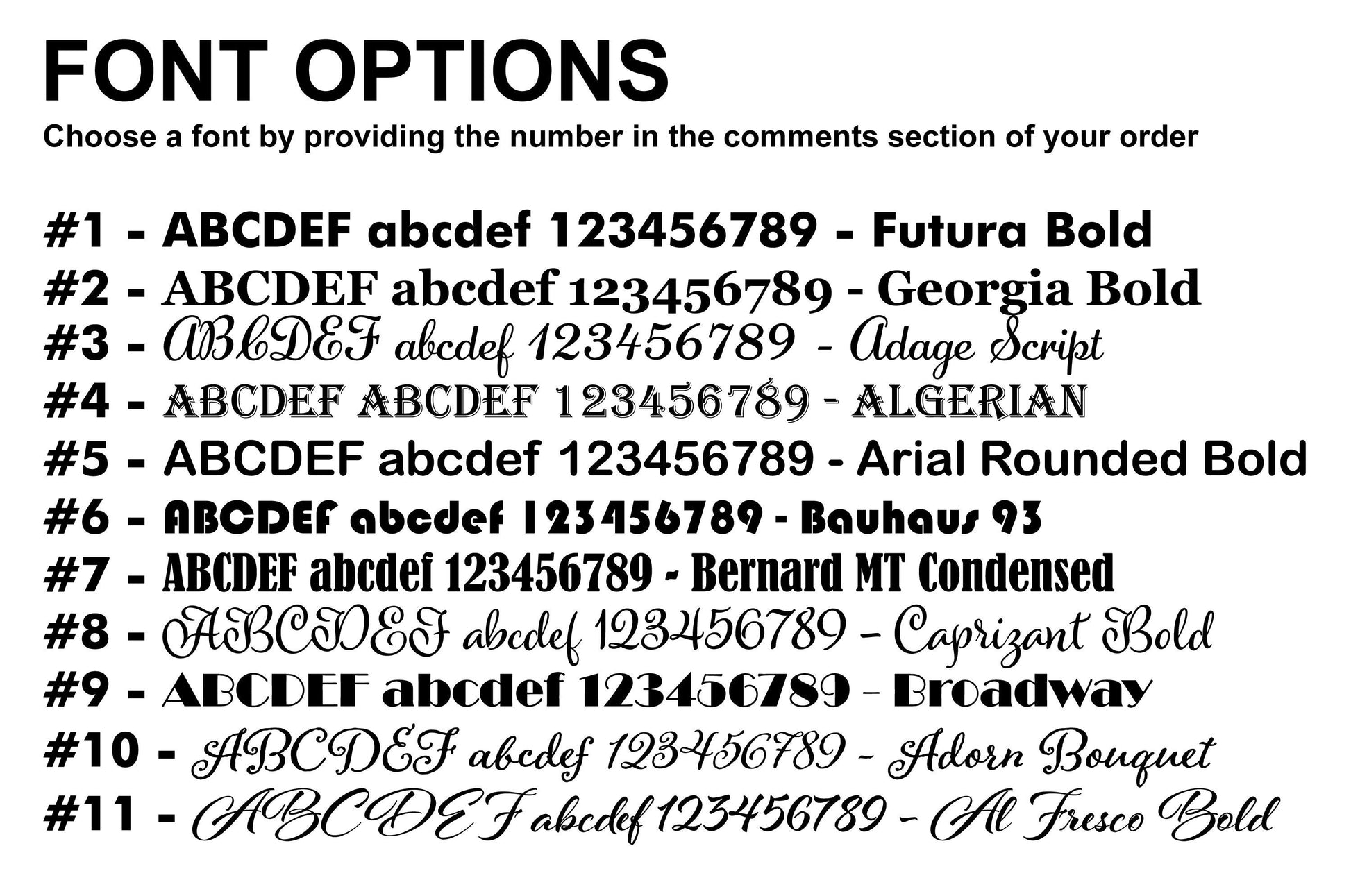 ******PLEASE CHOOSE A FONT FROM THE LIST (SEE PHOTO GALLERY FOR FONT OPTIONS)*****